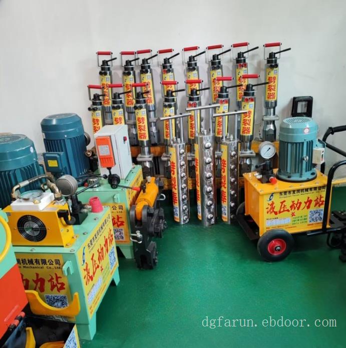 东莞发润机械有限公司主营矿山石材开采机械、工程建筑机械产品。液压劈裂机机是我们新研制的新产品,它由动力油站和劈裂机两大部分组成。按动力站类型可分为电动型、柴油型、种驱动力。液压劈裂机材质为钢制机。另还可以按机力量的大小来分类。能够使它在,竖井,涵洞,矿井,破拆室内混凝土等工程的破裂作业上游刃有余的发挥。